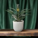 Zet de bromelia ananas in een lichte sierpot van keramiek of in een mand van zeegras voor een natuurlijke look. Combineer met monstera, palm of calathea voor een mini tropenhoek in huis.